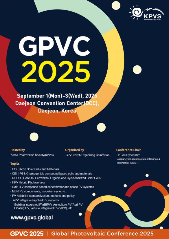 대전시와 한국태양광발전학회가 공동 주최한 ‘2025 글로벌태양광학술대회(GPVC 2025)’가 9월 1일부터 3일까지 대전컨벤션센터(DCC)에서 열린다. 전 세계 15개국 700여 명의 석학과 전문가가 참여해 페로브스카이트-실리콘 탠덤, 케스터라이트 등 차세대 태양전지 최신 성과를 공유하고, 건물·농업·수상·모빌리티 등 응용 분야 확산 전략을 논의한다.
