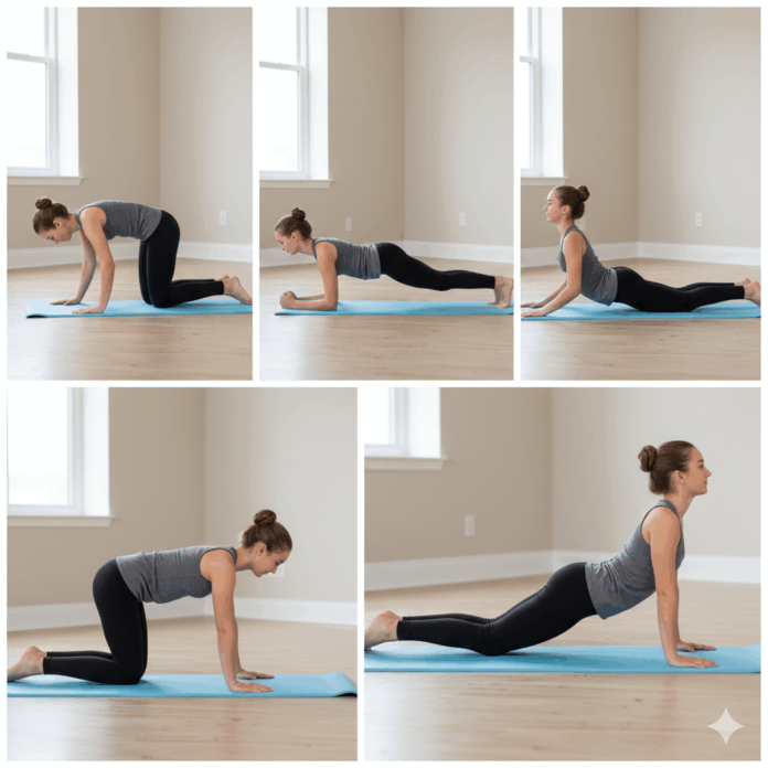숨을 마시면서: 등을 아래로 내리고 고개를 살짝 들어 천장을 바라봅니다 (소 자세). 이때 허리가 꺾이지 않도록 복부에 힘을 줍니다.